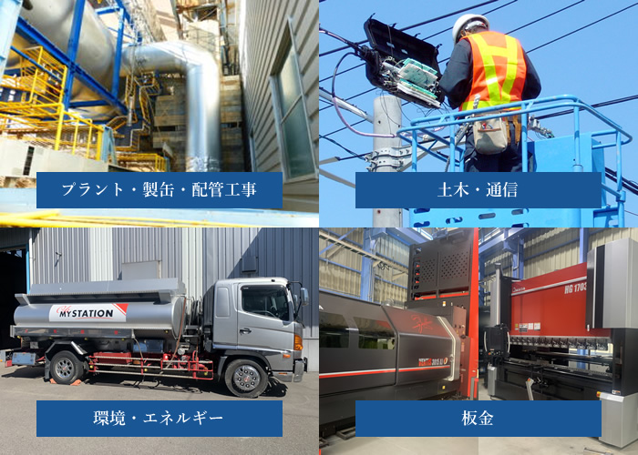 大手企業の協力会社として製缶、配管、プラント関係工事等々、請け負ってきた経験をもとに、現在では、土木、電気、エネルギー・環境事業、板金加工等お客様のあらゆるニーズにお応えしております。