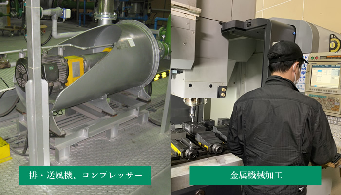 各種送・排風機、コンプレッサーにおいて、販売・修理・メンテナンスなど、ご要望に応じて様々なご提案をしております。また金属加工部門では、旋盤、マシニング、フライス等の機械を用い、様々な部品や製品の加工を行える体制を作っております。